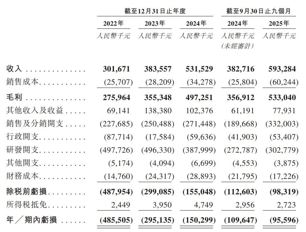 于2022年度、2023年度、2024年度、2025年截至9月30日止九个月,公司分别录得收入为人民币3.02亿元、3.84亿元、5.32亿元以及5.93亿元。