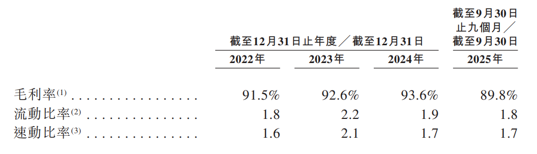 于2022年度、2023年度、2024年度、2025年截至9月30日止九个月,公司对应毛利润率为91.5%、92.6%、93.6%及89.8%。