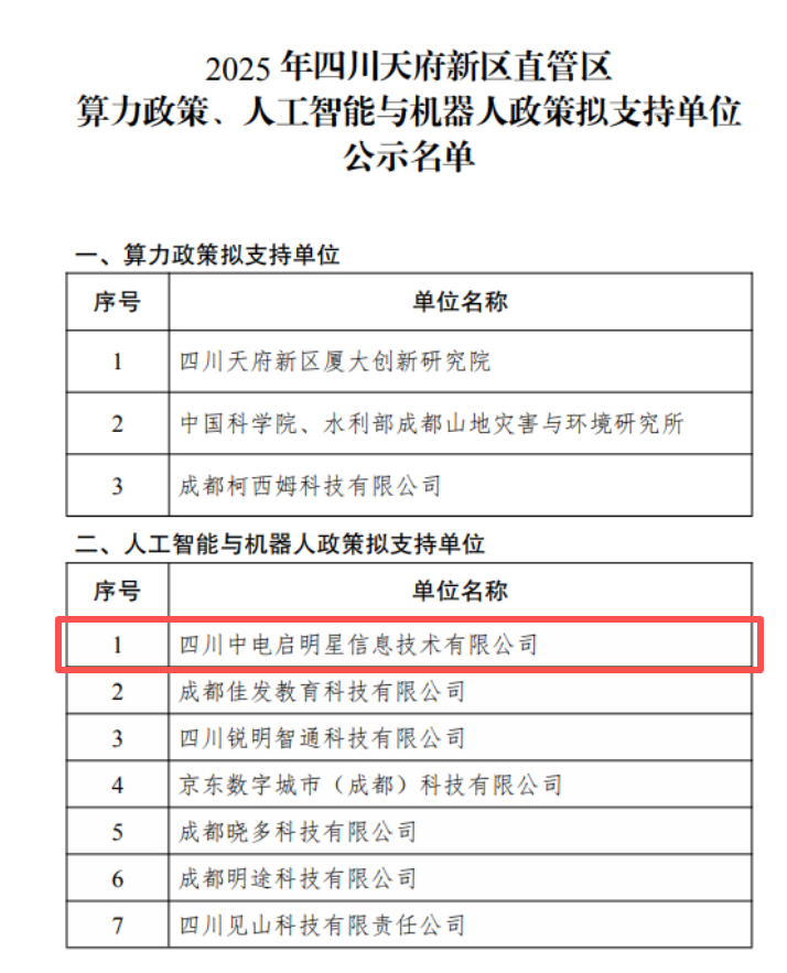 国网信通股份中电启明星成功入选“2025年四川天府新区直管区人工智能与机器