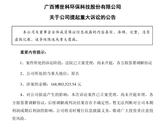 目前,博世科已收到湖南省湘西土家族苗族自治州中级人民法院出具的《民事案件受理通知书》。经人民法院组织各方沟通和协商,初步达成调解意向,各方拟签署调解协议。