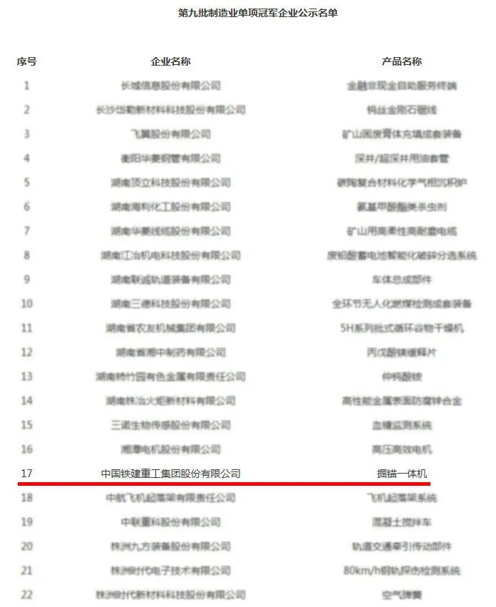 近日,国家工业和信息化部公布了第九批国家级制造业单项冠军企业名单和第三批通过复核的国家级制造业单项冠军企业名单,铁建重工再次上榜。其中“掘锚一体机”获第九批国家级制造业单项冠军,“全断面隧道掘进机”第3次获批国家级制造业单项冠军。包含“全电脑三臂凿岩台车”在内,铁建重工目前共有3个国家级制造业单项冠军。