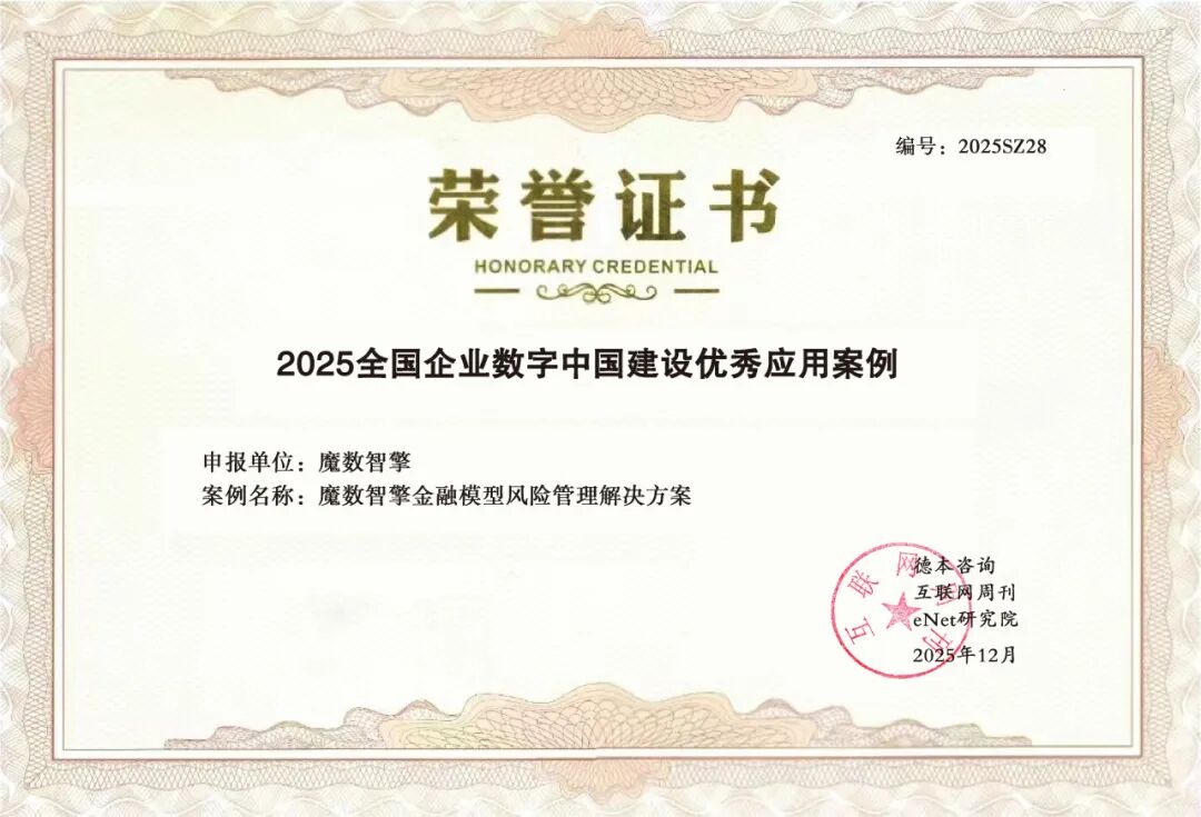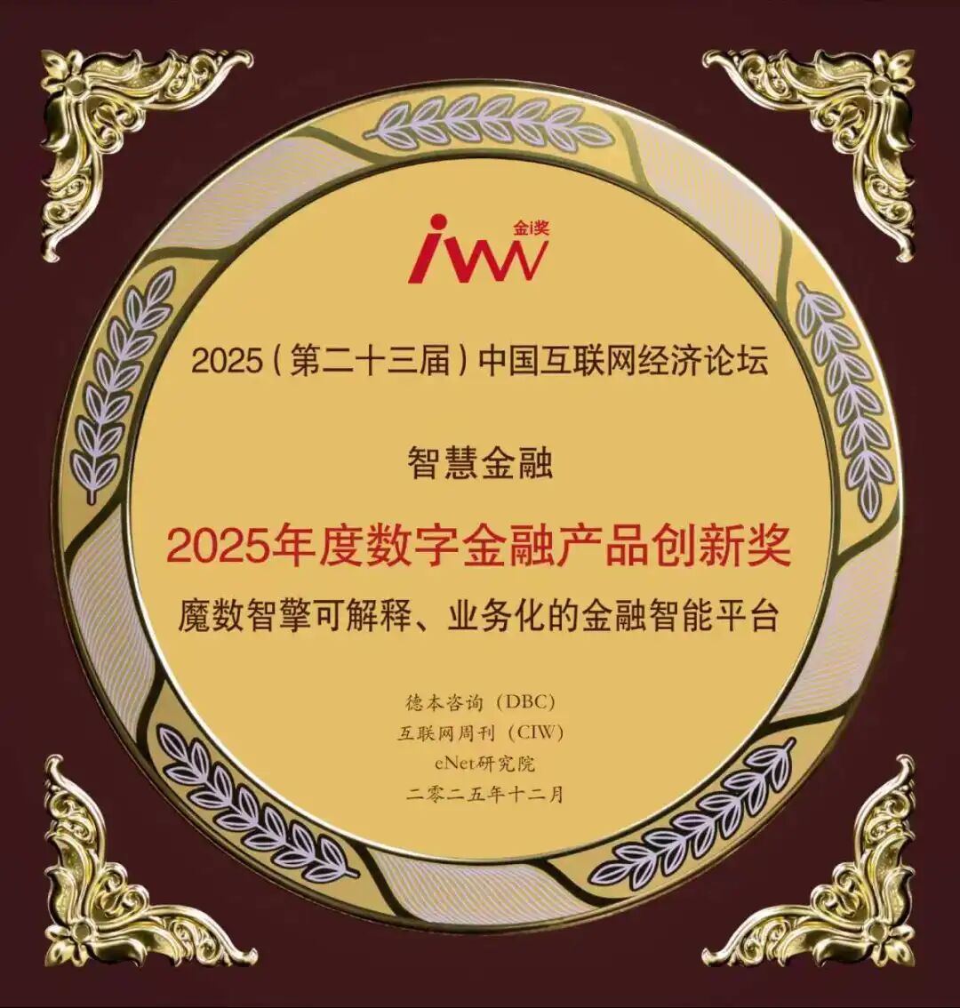 在由中国科学院《互联网周刊》、德本咨询、eNet研究院联合评定的2025(第二十三届)中国互联网经济论坛金i奖中,魔数智擎凭借在数字金融领域的扎实深耕与创新实践,荣膺“2025年度数字金融产品创新奖”,其“金融模型风险管理解决方案”同步入选“2025全国企业数字中国建设优秀应用案例”。