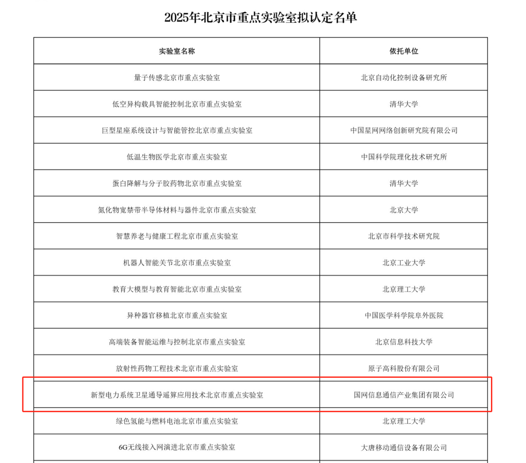 12月15日,北京市科学技术委员会、中关村科技园区管理委员会公布了2025年北京市重点实验室拟认定名单,由国网信通(600131)产业集团牵头申报的“新型电力系统卫星通导遥算应用技术北京市重点实验室”成功获批。