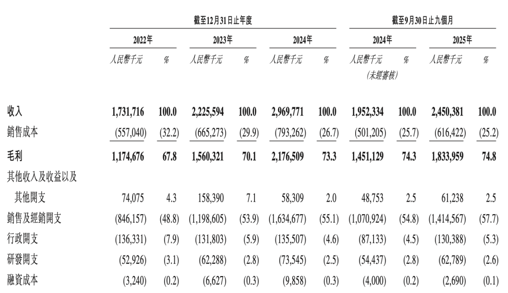业绩增长质量不足的背后,是公司高度依赖营销驱动的发展模式。根据招股书公布的数据,2022年、2023年、2024年以及2025年前九个月,丸美生物的销售费用分别为8.46亿元、11.99亿元、16.35亿元、14.15亿元,销售费用占营业收入的比重从48.8%攀升至57.7%。这意味着公司每获得1元收入,就有超过0.5元投入营销。