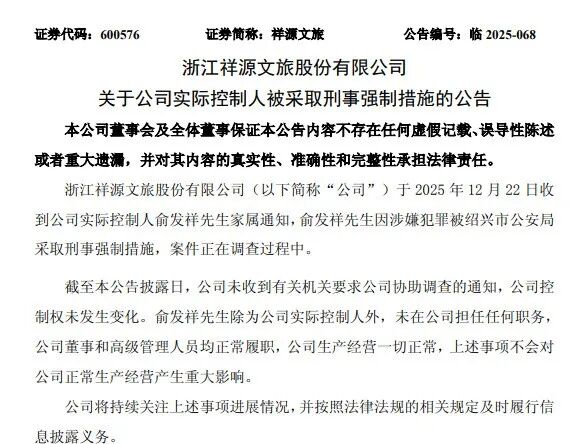 12月22日晚,交建股份(603815)、祥源文旅(600576)两家上市公司发布公告称,公司实际控制人俞发祥因涉嫌犯罪被绍兴市公安局采取刑事强制措施,案件正在调查过程中。