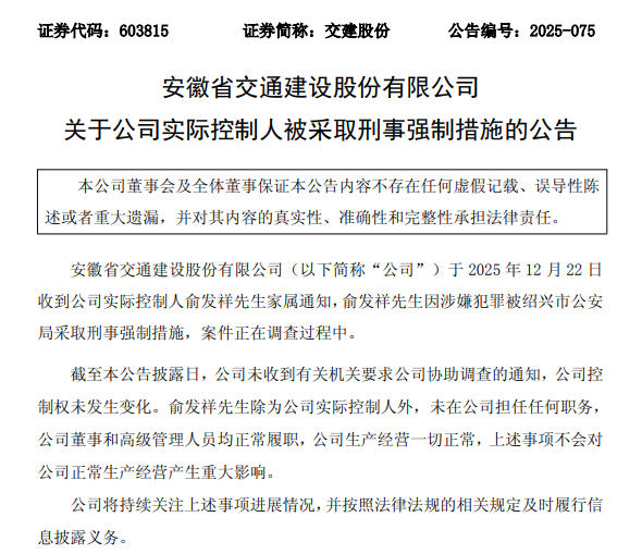 交建股份12月22日晚发布公告称,公司于12月22日收到公司实际控制人俞发祥家属通知,俞发祥因涉嫌犯罪被绍兴市公安局采取刑事强制措施,案件正在调查过程中。截至公告披露日,公司未收到有关机关要求公司协助调查的通知,公司控制权未发生变化。俞发祥除为公司实际控制人外,未在公司担任任何职务,公司董事和高级管理人员均正常履职,公司生产经营一切正常,上述事项不会对公司正常生产经营产生重大影响。公司将持续关注上述事项进展情况,并按照法律法规的相关规定及时履行信息披露义务。