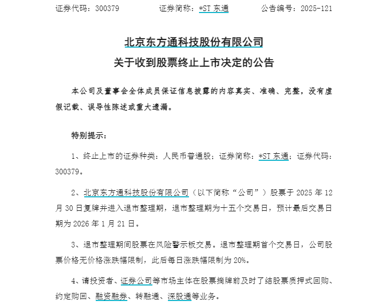 同日,*ST东通亦发布相关公告。公告显示,公司股票将于2025年12月30日复牌并进入退市整理期,退市整理期为十五个交易日,预计最后交易日期为2026年1月21日。退市整理期首个交易日,公司股票价格无价格涨跌幅限制,此后每日涨跌幅限制为20%。