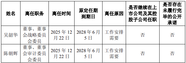 公司董事会于2025年12月22日收到公司总经理侯军虎先生、副总经理张戈临先生、财务负责人(总会计师)吴豪先生、董事会秘书黄永坚先生的辞职报告。因公司工作安排需要,侯军虎先生不再兼任公司总经理职务,张戈临先生不再担任公司副总经理职务,吴豪先生不再担任公司财务负责人(总会计师)职务,黄永坚先生不再担任公司董事会秘书职务,以上申请自辞职报告送达公司董事会之日起生效。上述高级管理人员离任不会对公司的正常运作及经营管理产生影响。公司及公司董事会对各位离任高级管理人员任职期间的勤勉工作与重要贡献致以诚挚谢意。