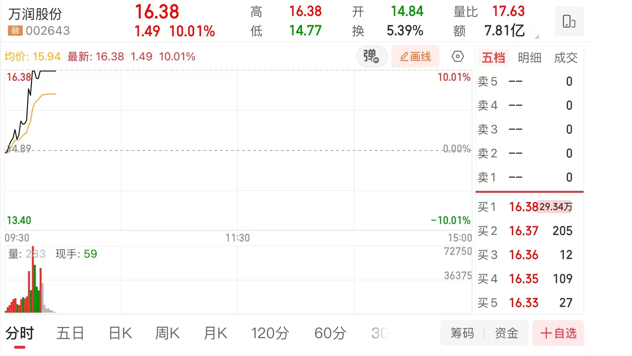 上证报中国证券网讯(记者李雁争)12月23日,万润股份(002643)盘中涨停,报16.38元。