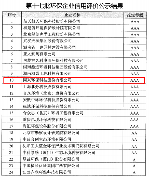 近日,中国环境保护产业协会正式发布第十七批环保企业信用评价结果。同兴科技(003027)成功获评AAA级信用企业,跻身国家级环保信用优质企业行列,标志着公司在诚信建设、合规经营及行业贡献等方面获得国家层面权威认可。