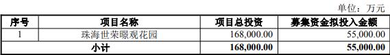 本次向特定对象发行可转换公司债券募集资金总额不超过55,000.00万元(含本数)。本次发行的募集资金在扣除发行费用后的净额将全部用于珠海世荣暻观花园项目。