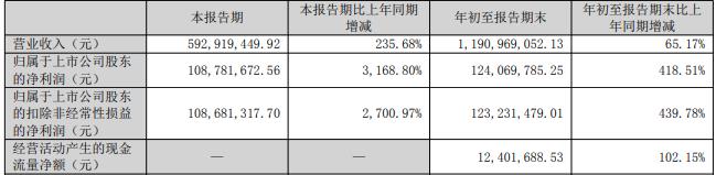 年初至报告期末,公司实现营业收入11.91亿元,同比增长65.17%;归属于上市公司股东的净利润1.24亿元,同比增长418.51%;扣除非经常性损益后的净利润1.23亿元,同比增长439.78%;经营活动产生的现金流量净额1240.17万元。