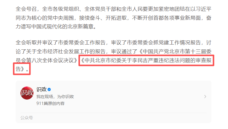据北京日报旗下“识政”微信公众号消息,12月22日,中国共产党北京市第十三届委员会第八次全体会议召开。消息称,全会审议通过了《中国共产党北京市第十三届委员会第八次全体会议决议》《中共北京市纪委关于李民吉严重违纪违法问题的审查报告》。