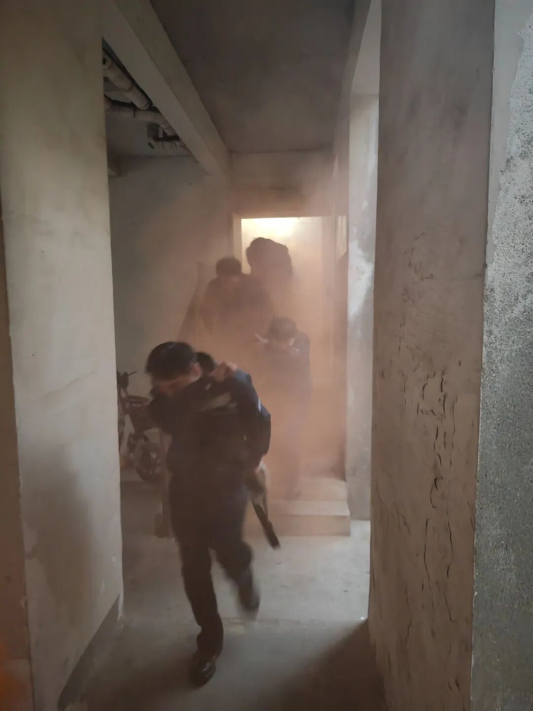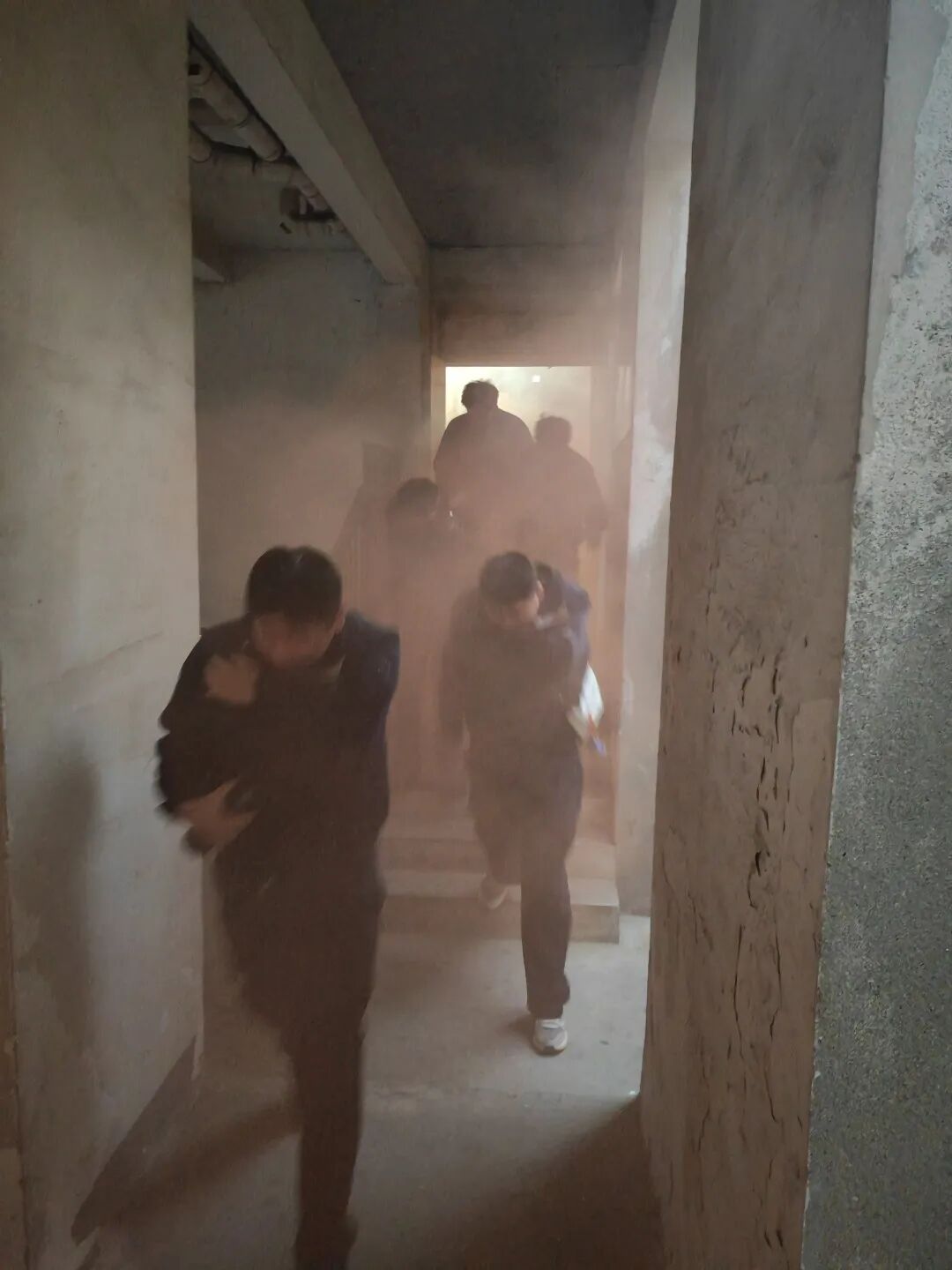 演练模拟宿舍楼突发火情,现场烟雾弥漫。警报响起后,员工在安全员引导下,用衣物捂住口鼻,沿预定路线低姿、快速撤离至安全区域。整个过程指令清晰、行动规范,均在短时间内完成全员疏散,体现了应急预案的有效性。