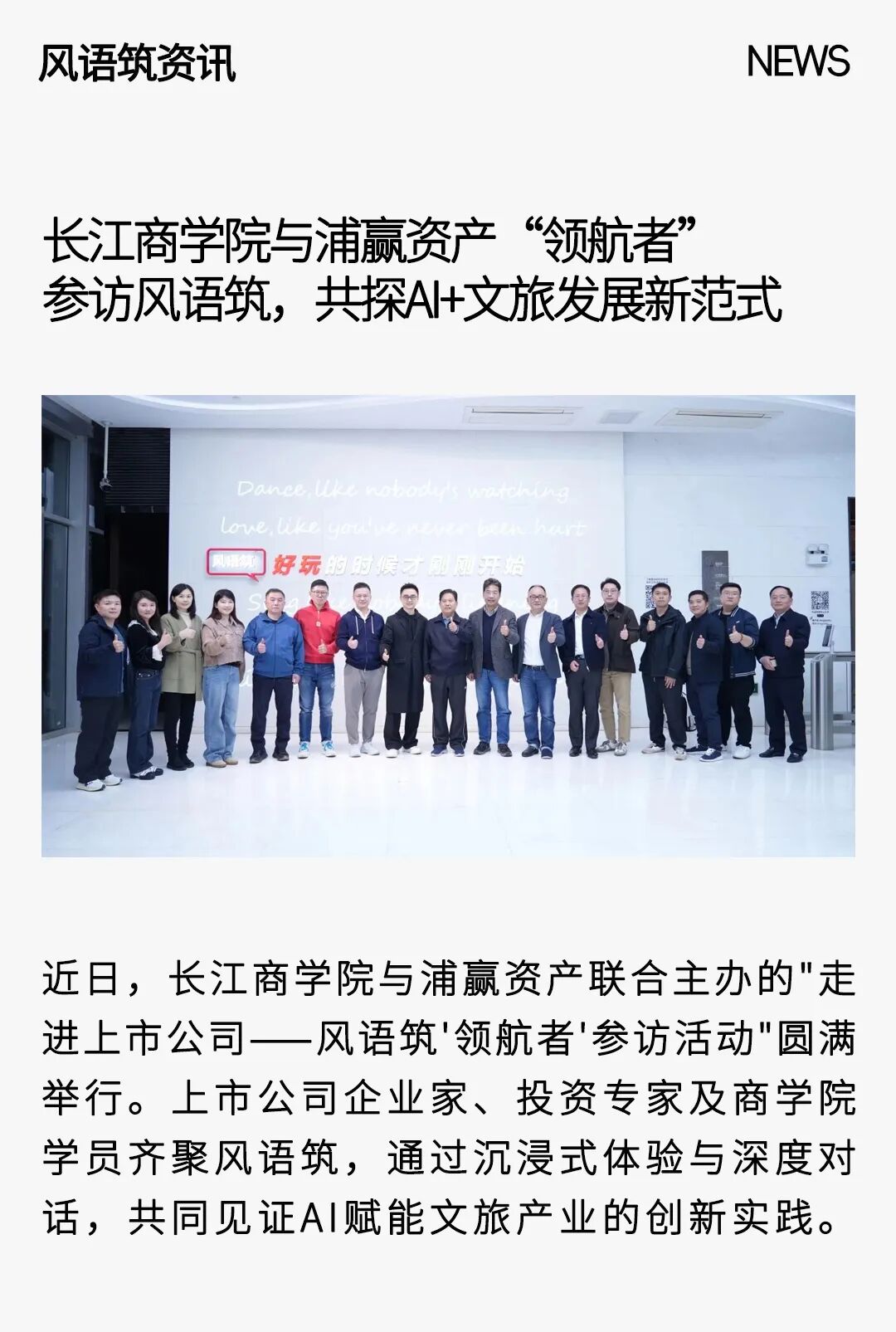 近日,由长江商学院与浦赢资产联合主办的“走进上市公司——风语筑(603466)‘领航者’参访活动”汇聚了上市公司企业家、投资专家以及商学院学员,共同探索AI与文旅融合发展的前沿趋势与实践成果。