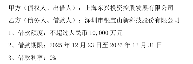 12月23日盘后,深圳市银宝山新(002786)科技股份有限公司(证券简称:银宝山新,股票代码:002786)公告称,为支持公司业务发展,提高融资效率,降低财务费用,公司控股股东上海东兴投资控股发展有限公司(以下简称“上海东兴”)向公司提供不超过人民币1亿元无息借款。