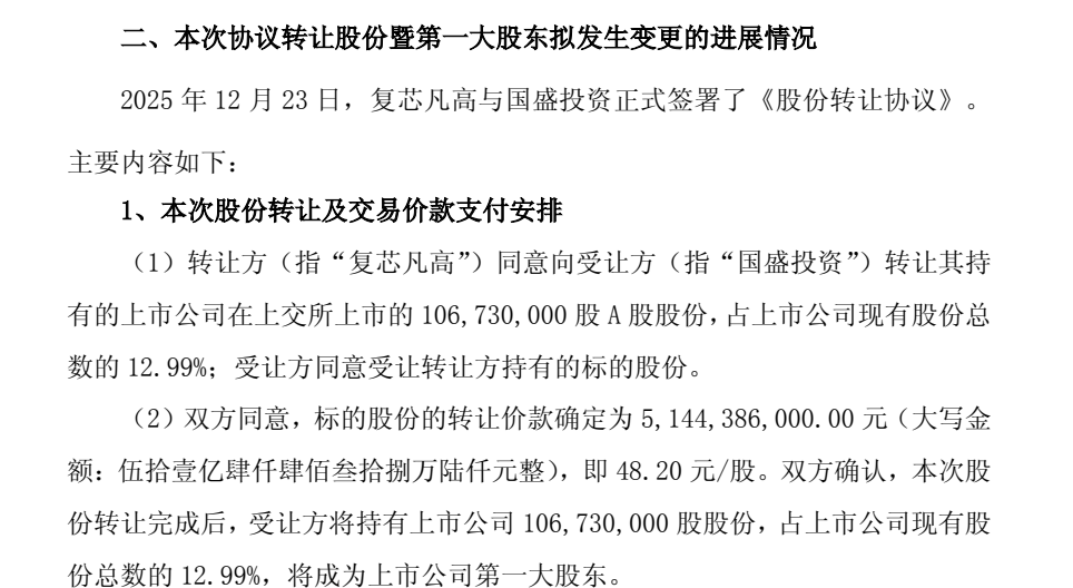 12月23日晚,复旦微电(688385)公告,复芯凡高与国盛投资于12月23日正式签署了《股份转让协议》。国盛投资拟受让复芯凡高持有的复旦微电1.07亿股A股股份,占复旦微电股份总数的12.99%,转让价款为51.44亿元。转让完成后,复芯凡高将不再持有复旦微电的股份,国盛投资将成为复旦微电第一大股东。复旦微电仍然为无控股股东、无实际控制人状态。