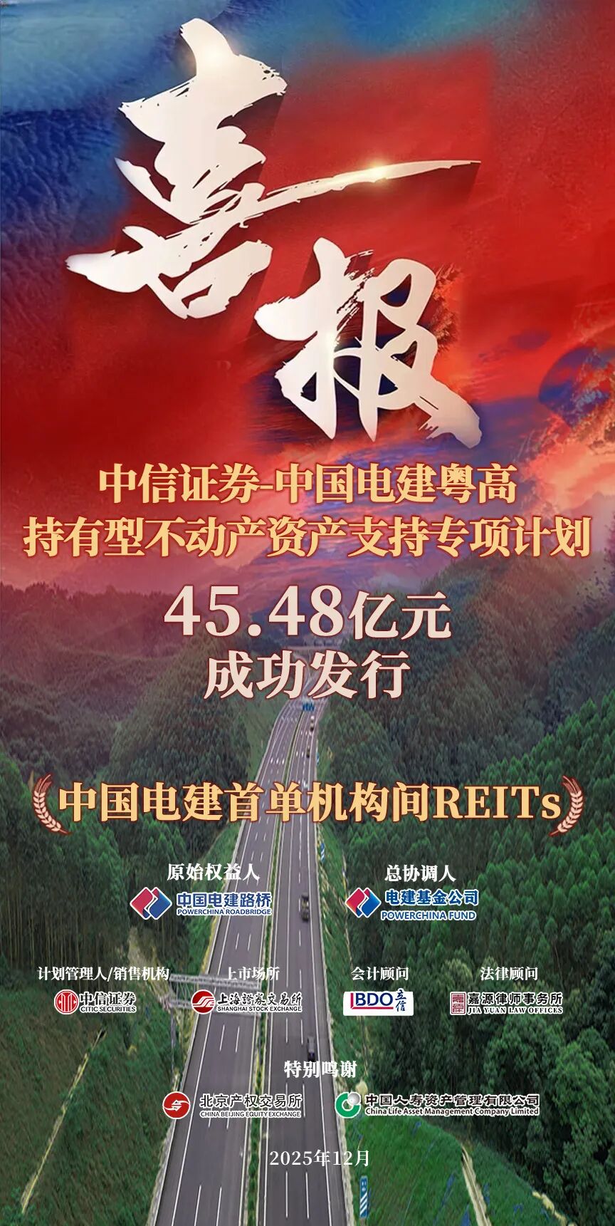 近日,“中信证券-电建粤高持有型不动产资产支持专项计划”在上海证券交易所成功发行,发行规模45.48亿元,产品期限24年。本次发行带动中国电建(601669)盘活存量资产规模超百亿元,为“十五五”期间公司全要素资产经营工作开辟了可复制、可推广的创新路径,为“水、能、城、数”核心领域逐步实现轻资产模式转型奠定坚实基础。