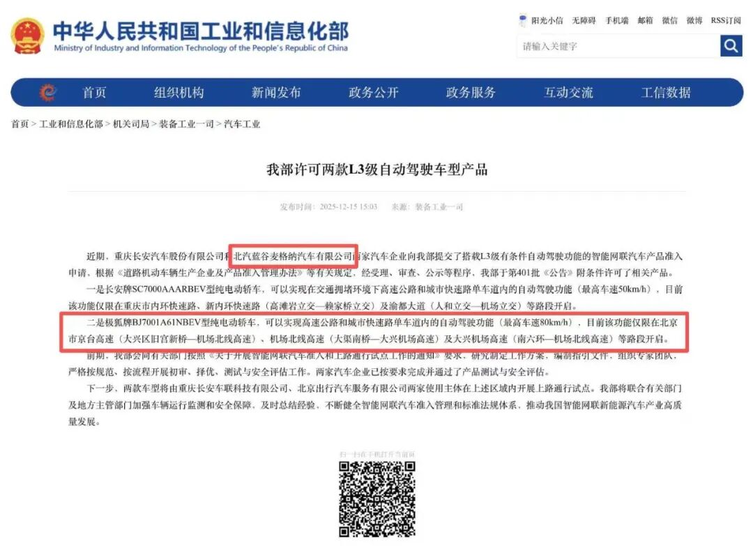就在一周前的12月15日,该车型刚刚获得工信部L3级产品准入许可。仅隔7天,自动驾驶专用正式号牌顺利上车,意味着“产品准入”与“上路通行”两大核心环节高效衔接,也体现了我国智能网联汽车管理体系已实现协同运作,步入成熟轨道。