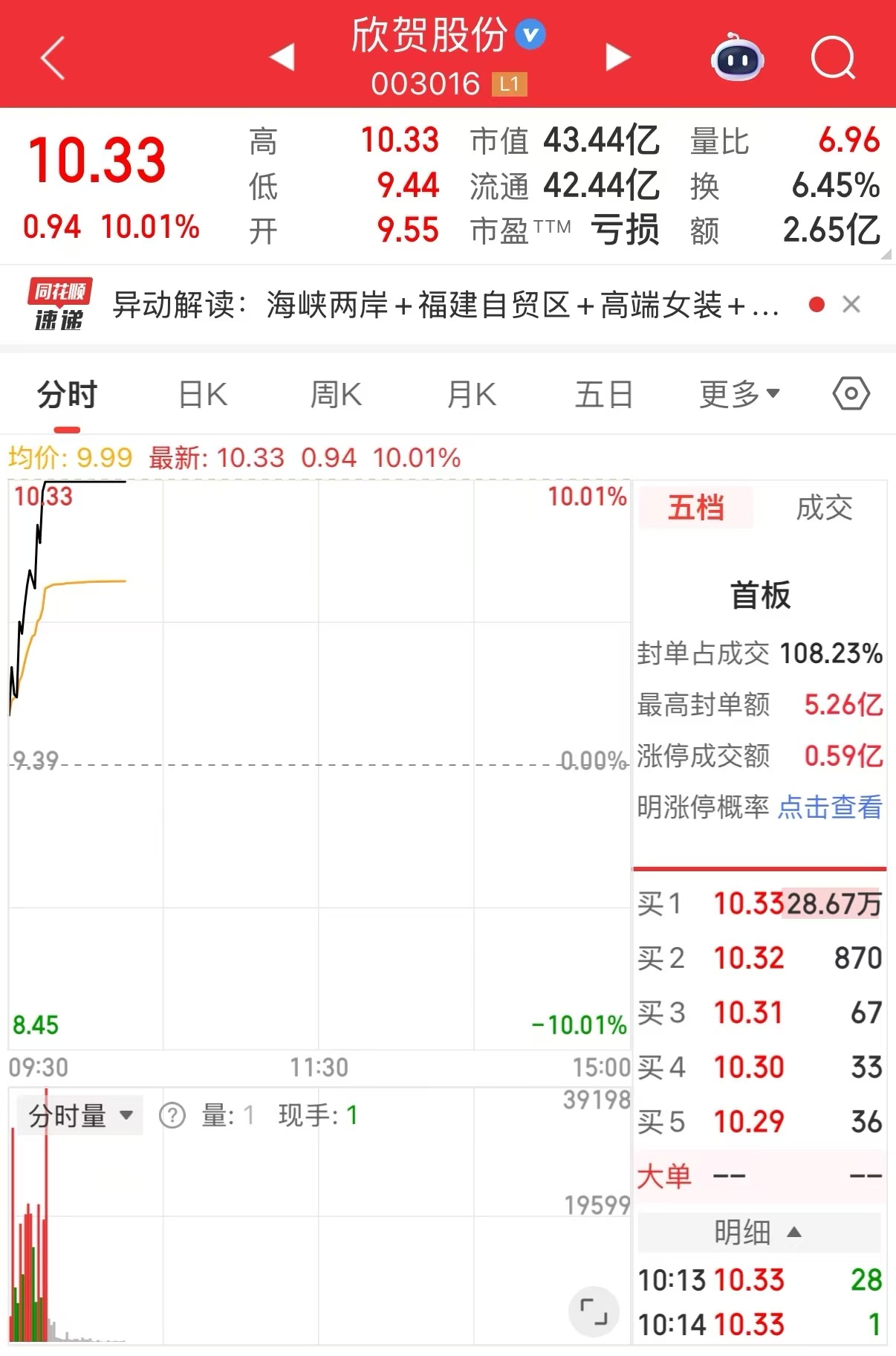 上证报中国证券网讯(记者李雁争)12月24日,欣贺股份(003016)盘中涨停,报10.33元。