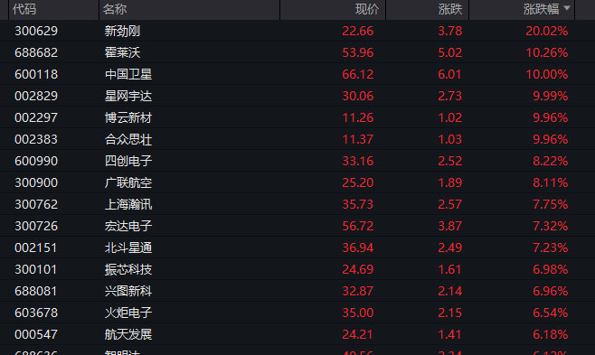 行业板块和赛道方面,若按照申万一级行业划分,国防军工板块大涨,板块盘中涨幅超过2%。新劲刚(300629)盘中“20cm”涨停,霍莱沃盘中涨幅一度超过12%,星网宇达(002829)、博云新材(002297)、合众思壮(002383)等股票盘中触及涨停,另有多股盘中涨幅超过5%。