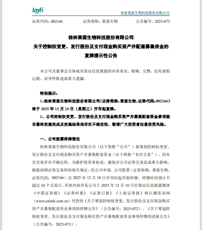 在停牌10个交易日后,莱茵生物(002166)(002166)正式披露资产重组及控制权变更预案。今日复牌,该股开盘即“一字”涨停,股价报9.57元/股,创年内新高。