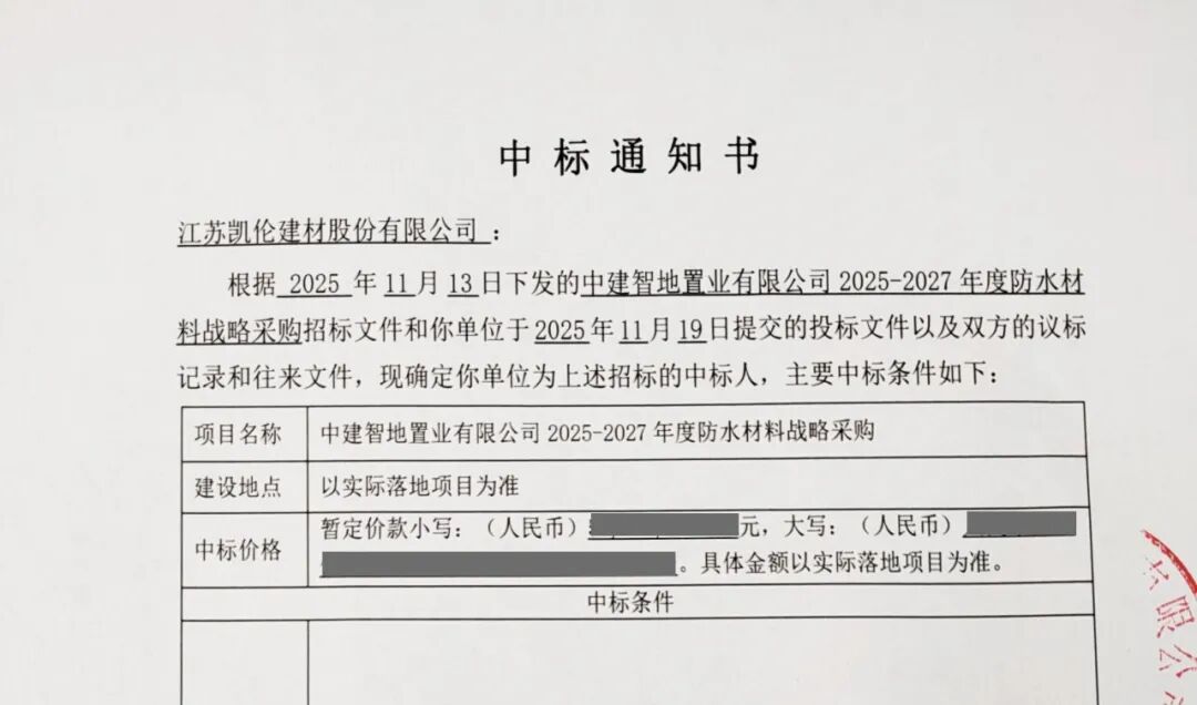 凯伦股份中标中建智地置业有限公司2025-2027年度防水材料战略采购项目