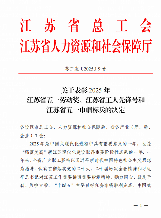 近日,江苏省总工会与江苏省人力资源和社会保障厅联合发布《关于表彰2025年江苏省五一劳动奖、江苏省工人先锋号和江苏省五一巾帼标兵的决定》,索普新材料盐化智能制造车间光荣上榜,被授予“江苏省工人先锋号”荣誉称号!这份荣誉既是对车间全体干部职工辛勤付出的肯定,更是对索普新材料高质量发展成效的有力彰显。