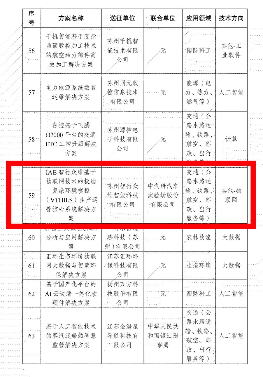 近日,江苏省工信厅公布了《2025年江苏省信息技术应用创新典型解决方案(应用案例)和领先实践项目入围名单》,围绕中汽股份(301215)智能网联复杂环境多维模拟平台打造建设的“基于物联网技术的极端复杂环境模拟(VTHILS)生产运营核心系统解决方案”成功入选。