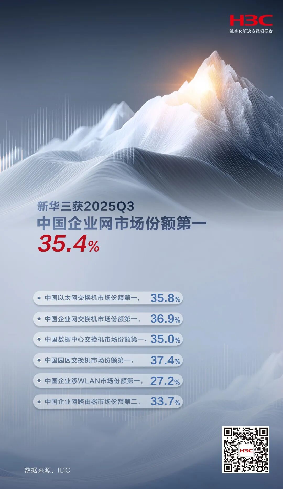 近日,国际数据公司IDC公布2025年第三季度网络产品基础数据,紫光股份(000938)旗下新华三集团以35.4%的市场份额稳居中国企业网市场第一,在企业网交换机、以太网交换机、数据中心交换机、园区交换机、企业级WLAN及企业网路由器等多个核心细分市场持续保持领先。多项关键指标同时登顶,标志着新华三已在中国企业级网络领域形成稳定、可持续的领先格局。