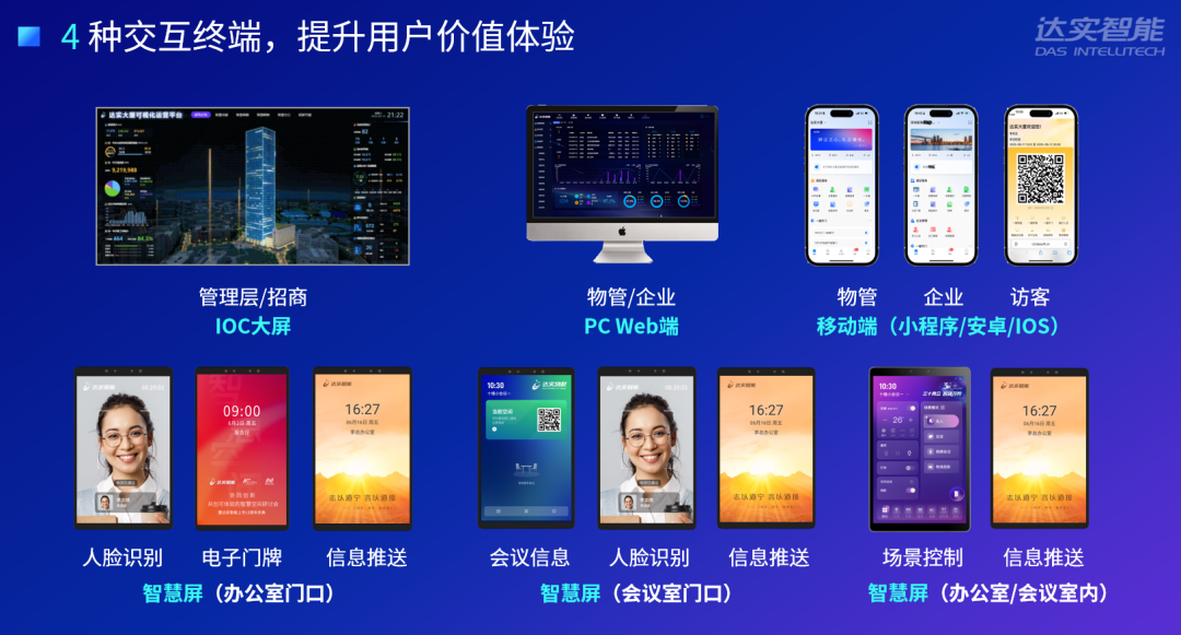 交互屏屏则安装在办公室、会议室、电梯厅等地,统一助实现人脸识别、电子门派、信息推送、场景控制等功能。