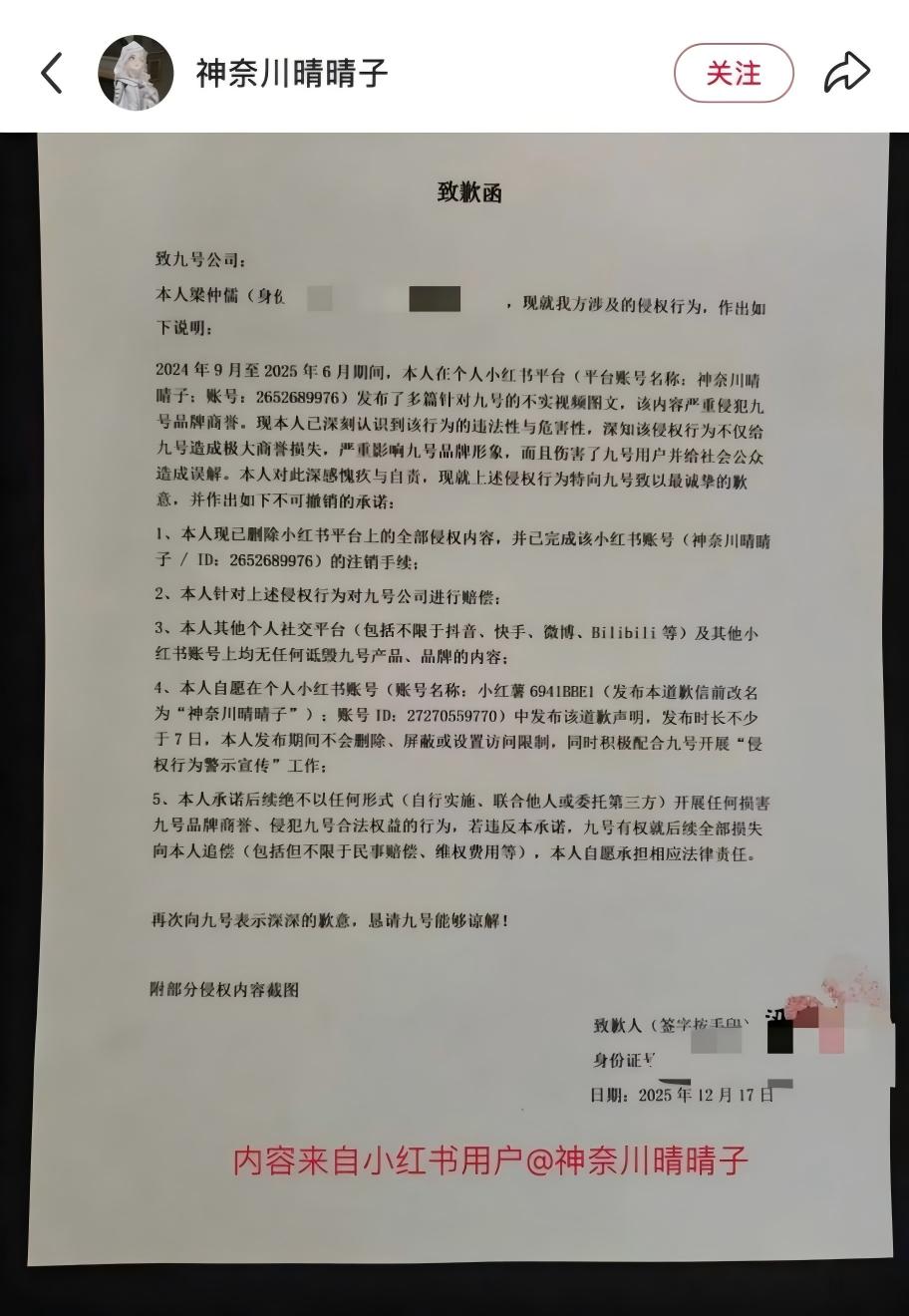图为“黑水军”账号“神奈川晴晴子”公开致歉函截图。
