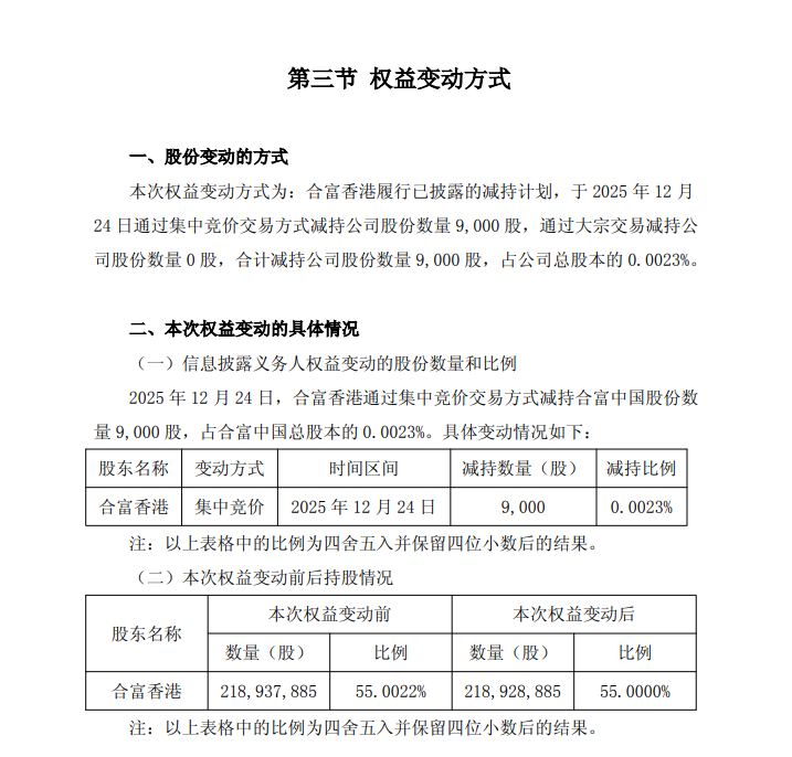 12月24日,合富中国(603122)(603122.SH)公告称,公司控股股东合富(香港)控股有限公司于2025年12月24日通过集中竞价交易方式减持公司股份数量9000股,占公司总股本的0.0023%。本次权益变动后,合富香港持有55%公司股份。根据相关法律法规要求,控股股东权益变动触及5%刻度时需披露《权益变动报告书》,公司依此发布提示性公告。