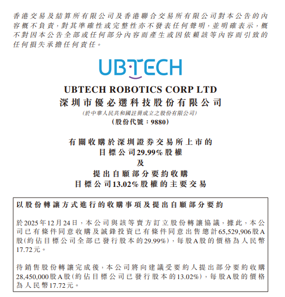 12月24日晚,人形机器人龙头股优必选(09880.HK)公告,拟以“协议转让+要约收购”的组合方式共收购深交所上市公司锋龙股份(002931)约43%的股份。