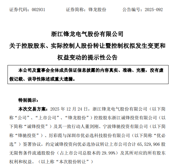 同日晚间,锋龙股份发布公告称,诚锋投资及其一致行动人董剑刚、宁波锋驰投资有限公司、厉彩霞与深圳市优必选科技股份有限公司于12月24日签署股份转让协议,后者将受让6552.99万股无限售条件流通股,占锋龙股份总股本的29.99%,每股转让价格为17.72元,交易总对价达11.61亿元。