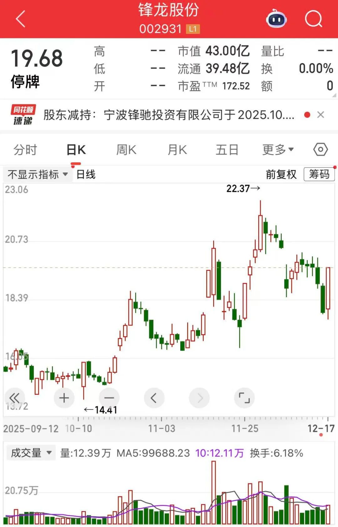 锋龙股份股票12月17日涨停。当日晚间,公司披露了筹划控制权变更事项的停牌公告,公司股票自12月18日开市起停牌。根据最新公告,公司股票自12月25日开市起复牌。