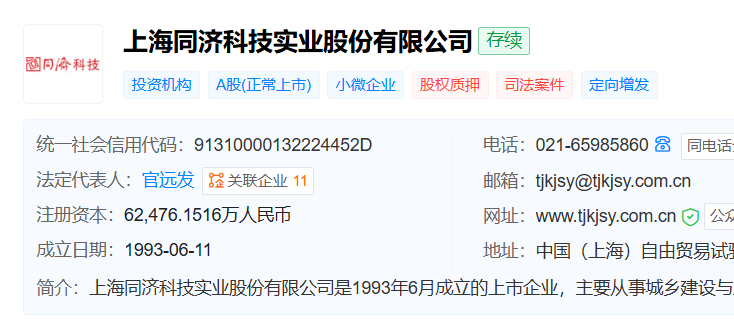 天眼查显示,同济科技成立于1993年6月,位于上海市,1994年3月在上交所主板上市,是一家城乡建设与发展领域价值提升综合服务企业,主营业务包括决策咨询、项目管理、建设施工、运营维护、投融资和数值赋能。