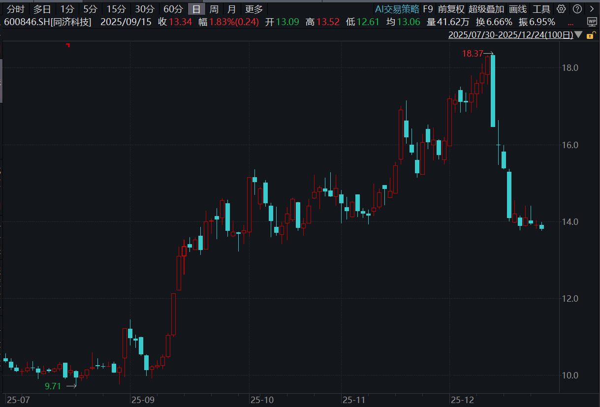 同济科技12月10日晚披露否决二股东临时提案的公告。披露后第二日,即12月11日,公司股价跌停。截至12月24日收盘,同济科技股价自12月11日以来已下跌24.55%。