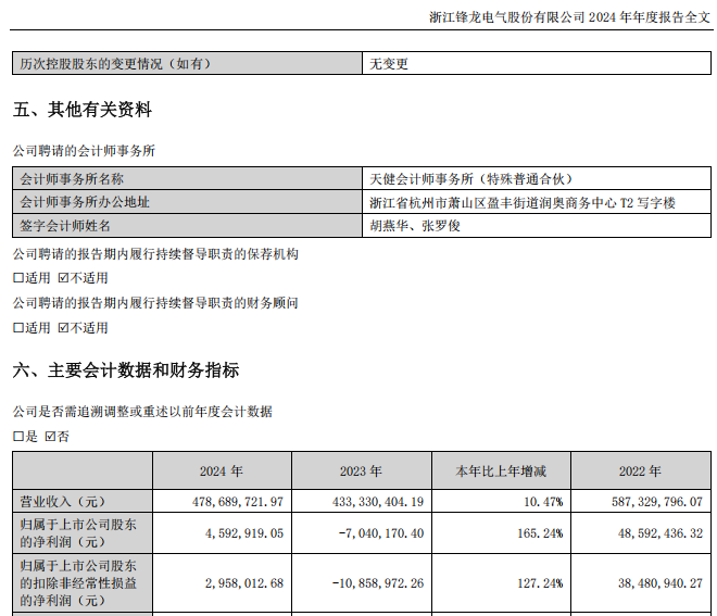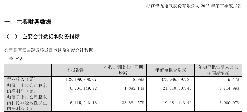 2024年及2025年前三季度,锋龙股份的归母净利润分别为459.29万元及2151.85万元,扣非后净利润分别为295.80万元及1918.14万元。