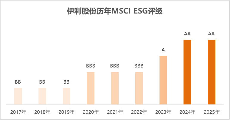 从MSCI ESG评级来看,伊利股份自2024年评级提升至AA级以来,今年再度获评AA级,属于中国食品行业最高的ESG评级,充分凸显权威机构对公司ESG实践的高度认可。