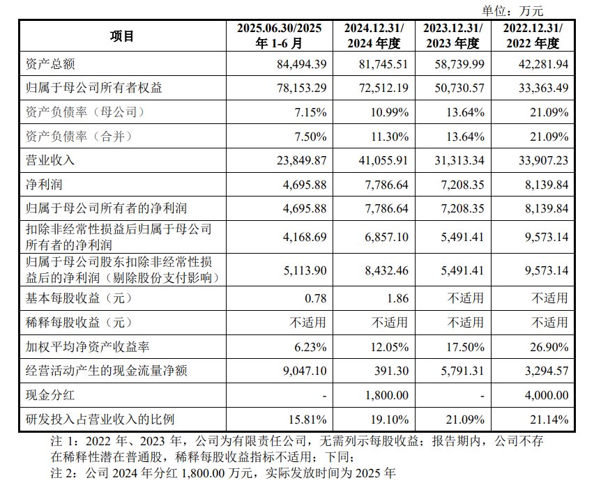 财务方面,于2022年度、2023年度、2024年度、2025年1-6月,公司实现营业收入3.39亿元、3.13亿元、4.11亿元、2.39亿元;同期,录得净利润8139.84万元、7208.35万元、7786.64万元、4695.88万元。