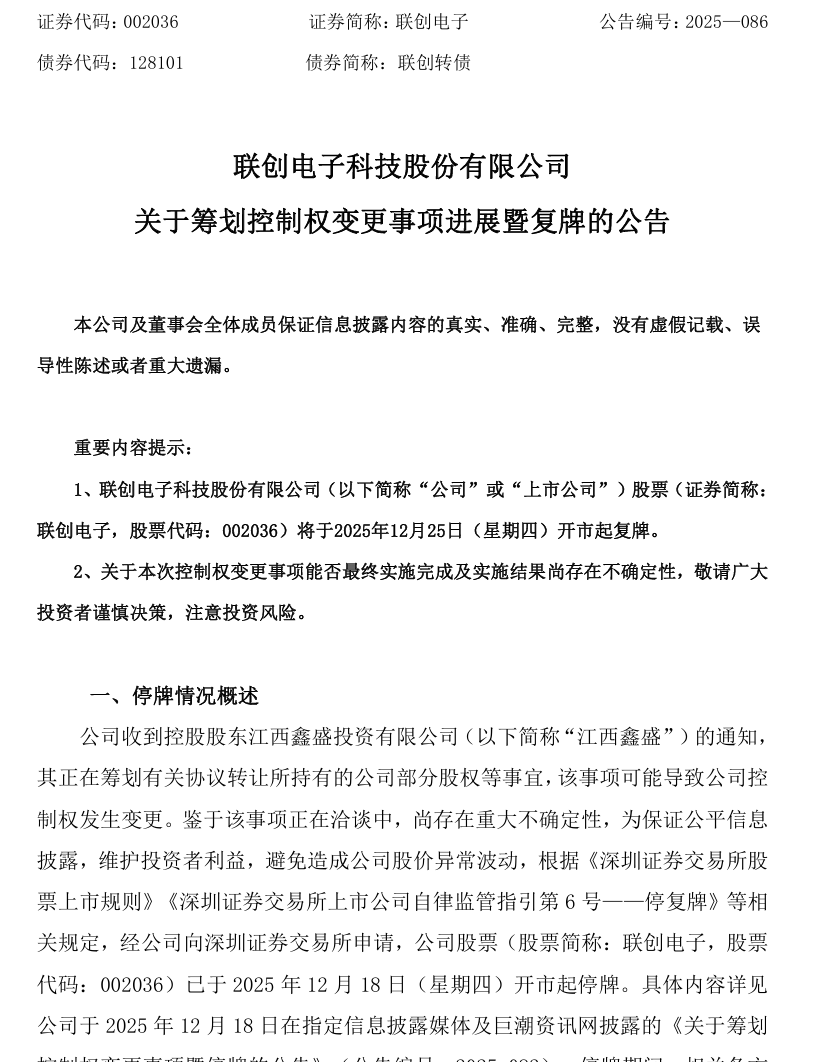 12月24日晚,在停牌筹划控制权变更事项5个交易日后,联创电子(002036)(002036)披露了最新进展。