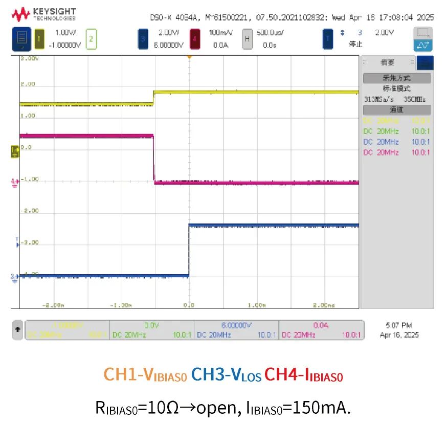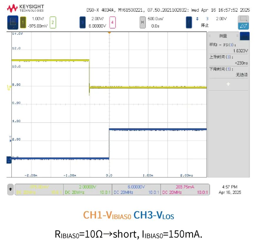 SGM41290集成4路12位IDAC(IBIAS0-IBIAS3),通过I C控制IBIAS电流增益寄存器(IBIAS_GAIN_CTRL Register)可实现最高300mA的偏置电流输出。器件支持多路并联方案进一步增大偏置电流到最高300mA×4=1.2A,出色的电流驱动能力可以满足大多数激光二极管的电流偏置需求。硬件/软件EN的灵活控制可以保证电流输出的一致性,避免繁琐的时序控制调试,而硬件EN的快速关断功能有助于后级负载的快速泄放,有效避免后级残压带来的不可控情况。