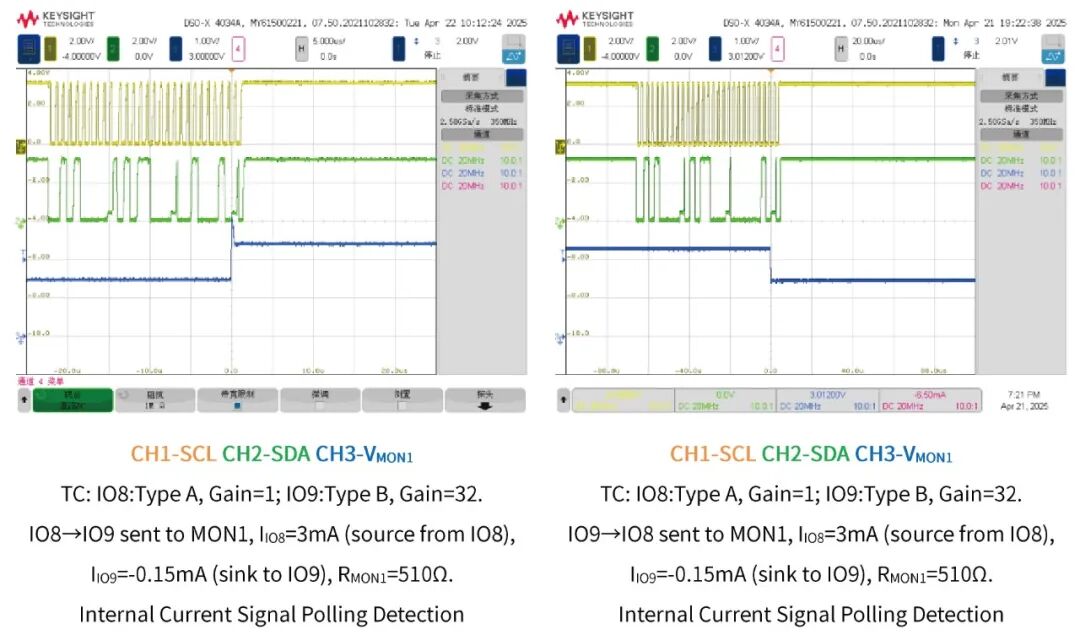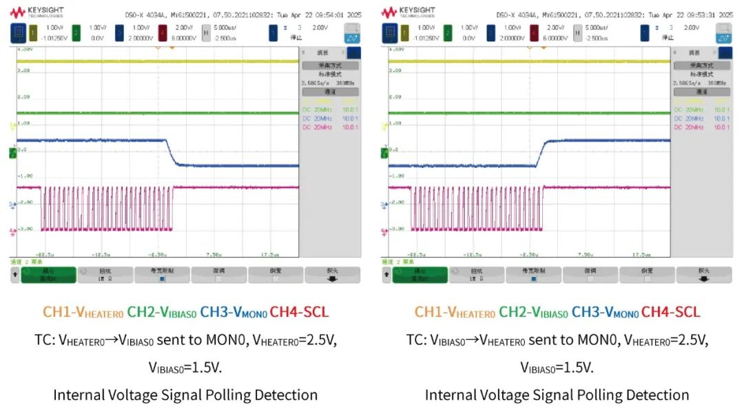 硅光应用中,经常需要多路MPD监测光强,而后级MCU的ADC和IO资源有限。SGM41290针对这一问题,提供了MON0和MON1引脚同时输出两路电流/电压信息,同时还可以通过软件配置轮询输出。以下图为例,分别将MON0和MON1配置成电压和电流监测模式:MON0用于轮询监测HEATER0和IBIAS0的端口电压信息,MON1用于轮询监测接入MULTI_IO8和MULTI_IO9的MPD电流信息。