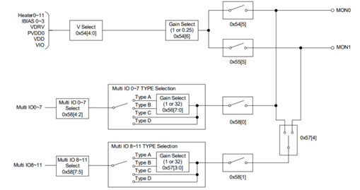MULTI_IOx通过寄存器MULTI_IO_CTRLx Register配置IO的功能类型,通过读取引脚(MON0/MON1)输出相应的电压/电流信息监测信号,具体配置逻辑如图15所示。