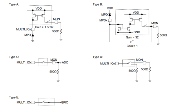 对于MPD电流监测场景,MULTI_IOx可以配置成Type A - Type D四种类型,如图16所示。