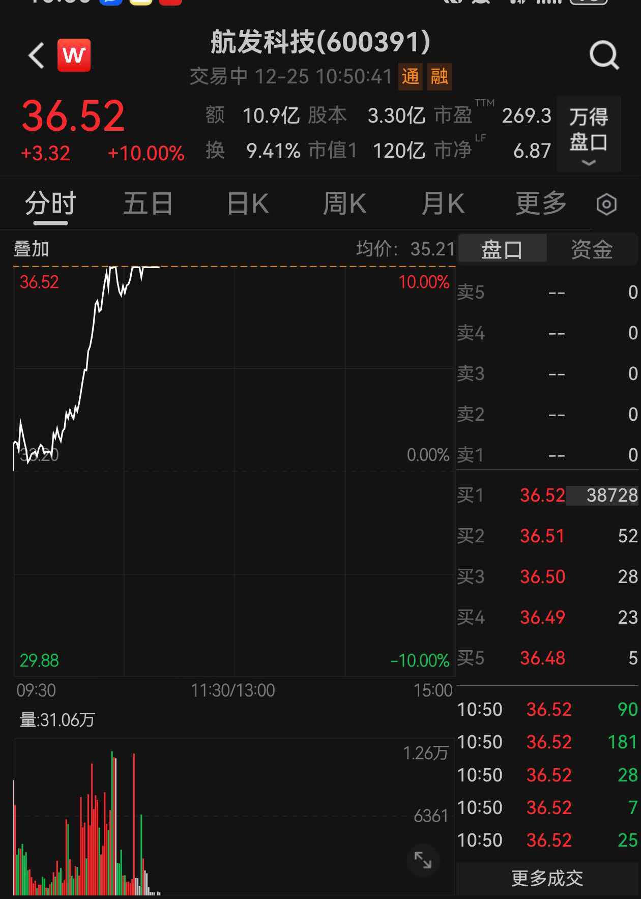 上证报中国证券网讯(记者于祥明)12月25日10点40分,航发科技(600391)涨停。此前,12月19日,航发科技曾以涨停收盘。