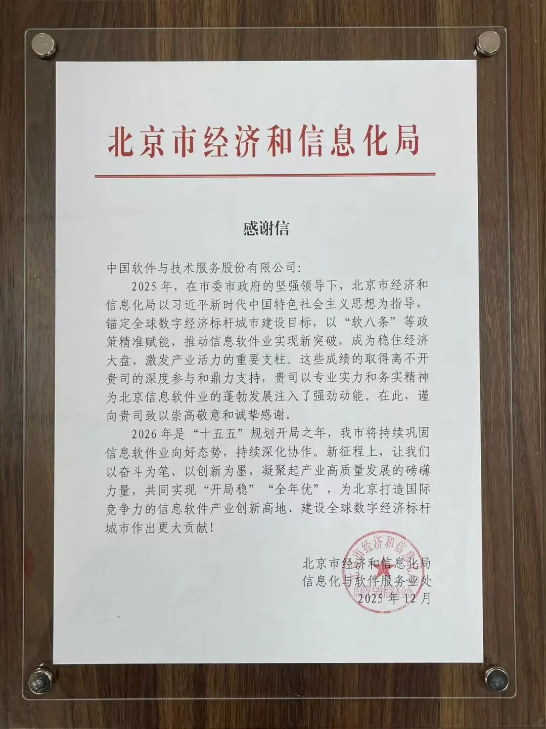 会上,中国软件还收到来自北京市经济和信息化局的感谢信。信中对中国软件在2025年为推动北京信息软件业实现新突破、支撑全球数字经济标杆城市建设所做出的突出贡献表示崇高敬意和诚挚感谢,并对公司的专业实力与务实精神给予了高度赞赏。