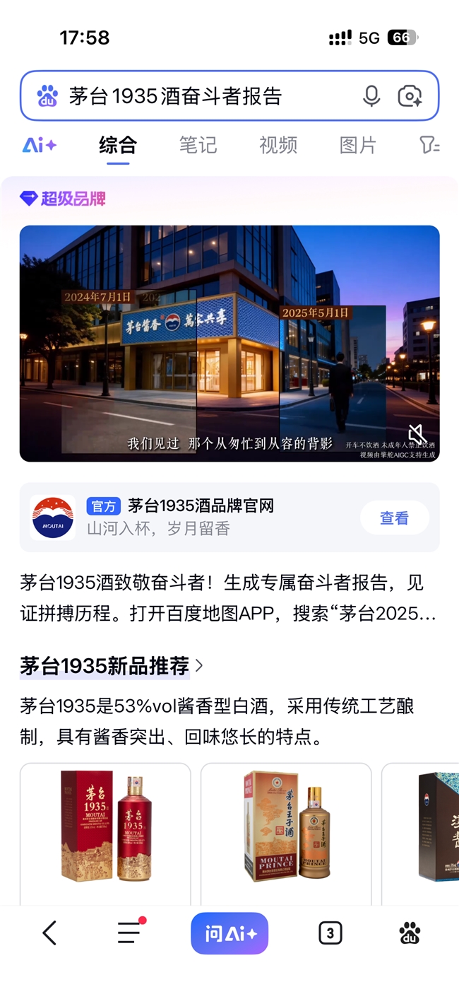 通过百度AI营销产品和地图创新玩法的深度整合,茅台酱香酒实现了从用户认知、情感共鸣到线下行动的全链路升级。新搜索与智能体构建了即问即答的智能交互场景,擎舵AIGC技术实现了低成本高质量视频内容生成,而百度地图则作为重要的生活场景入口,将用户行为回顾事件转化为茅台酱香酒情感叙事载体。在这一过程中,品牌信息呈现、用户互动与服务触达之间形成自然流畅的衔接。