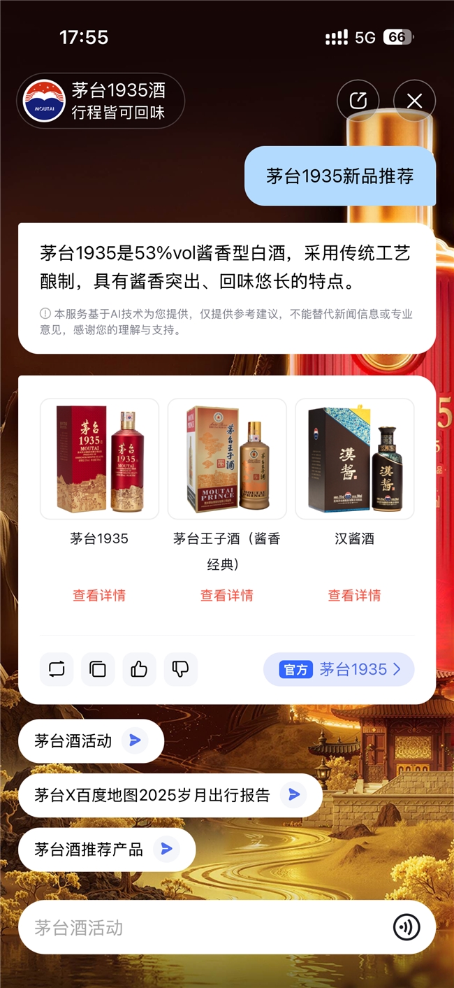 而新搜索页面搭载的茅台酱香酒智能体,更是提供了深度的需求满足和服务承接能力。例如,点击"茅台1935新品推荐",进入智能体,用户可询问产品推荐等具体问题,获得即时、专业的回复,这相当于为每位用户都配备了一位24小时在线的专业服务顾问,将搜索行为转化为可延续的沉浸式对话体验,从而提升全链路用户体验,缩短从认知到兴趣乃至进一步转化的路径。